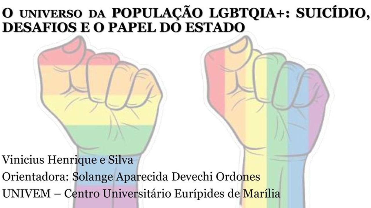 A pesquisa apresentada pelo aluno busca analisar e debater o papel do Estado como garantidor do direito à igualdade e à dignidade da pessoa humana, considerando o alto índice de suicídios dentro da população LGBTQIA+ permeando as teorias sociais, filosóficas e jurídicas que buscam explicar o fenômeno, entender a vulnerabilidade e as dificuldades enfrentadas por este público, como ainda, balizar as legislações anteriores e atuais.