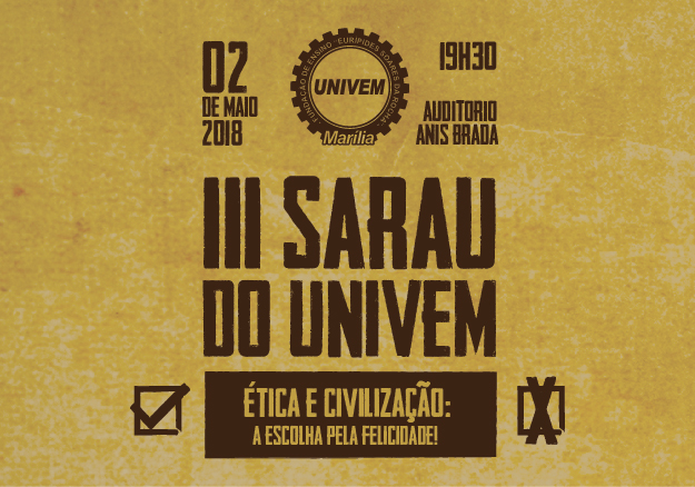 O UNIVEM realiza, na próxima quarta-feira, 2 de maio, às 19h30, no Salão Nobre, o III Sarau com o tema "Ética e Civilização: a escolha pela felicidade". O evento cultural/artístico faz parte do Projeto "Cultura e Arte na Universidade", idealizado pelo Grupo de Extensão de Administração (GEA) com o apoio e participação dos cursos de Administração, Ciências Contábeis, Engenharia de Produção, Gestão de Recursos Humanos, Design Gráfico e Processos Gerenciais, Grupo Musical do ProAto do Direito e ETEC "Antônio Devisate".