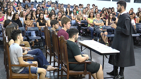 Nem bem as aulas começaram e o procedimento penal já foi apresentado aos novos alunos do curso de Direito do Centro Universitário Eurípides de Marília (Univem). Na última quarta-feira (7), o salão nobre do centro universitário se transformou em um Tribunal do Juri. A simulação do julgamento de um caso de homicídio passional ocorrido na década de setenta foi presidida pelo Prof Dr Roberto da Freiria Estevão. Na acusação e defesa, alunos do sétimo e quinto termos. Ocupando os lugares dos jurados, os calouros. Foram eles que, a partir das alegações da promotoria e defesa, decidiram o futuro do réu.